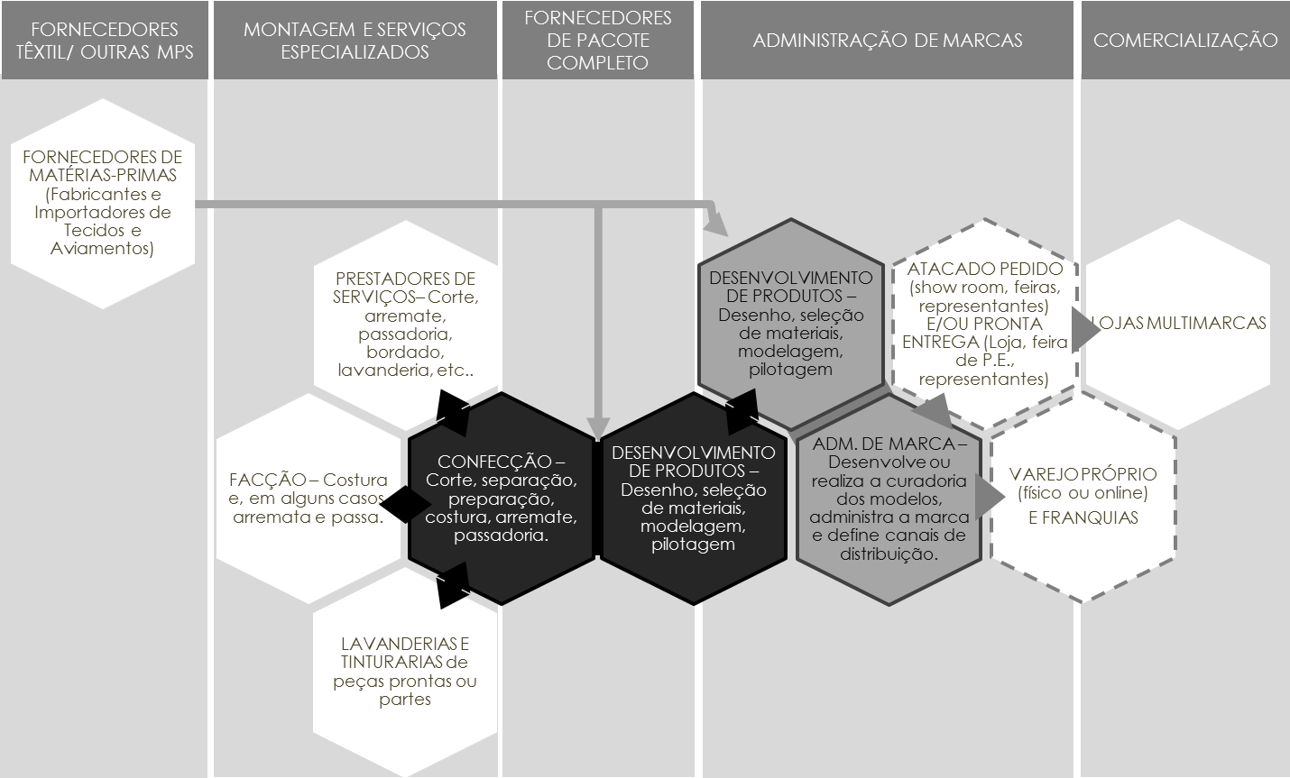 A cadeia têxtil-vestuário é caracterizada pela fragmentação na qual, as empresas detentoras de marcas definem as principais diretrizes que governam os elos à montante – cadeia têxtil, confecções de pacote completo e seus subcontratados; e à jusante – canais de distribuição, incluindo atacado e varejo (Gereffi e Memedovic, 2003).