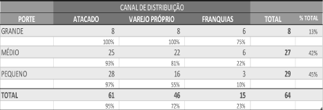 Das marcas cujos processos de desenvolvimento de produtos foram estudados a partir da confecção escolhida para a pesquisa, oito são de grande porte, vinte e sete de médio porte e vinte e nove de pequeno porte. Foram consideradas empresas de grande porte, as com um número de funcionários superior a 100 pessoas, médio porte, aquelas com número de funcionários entre 21 e 100 pessoas, e pequeno porte, as empresas com até 20 funcionários.