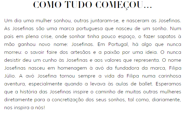 Szabluck; Linden; Bernardes (2015) explicam que explorar as histórias reais da marca, como sua origem, missão e valores, de modo que o público possa conhecer a marca mais a fundo e criar identificação e laços emocionais, podem gerar uma experiência que se alinha com os desejos mais íntimos do consumidor. Ao contar a origem da empresa, como começou e de onde vieram as fundadoras, a Josefinas narra uma história que já ocorreu, mas permite que se compreenda e se valorize sua realidade no presente, passando mensagens que inspiram o comportamento do público.