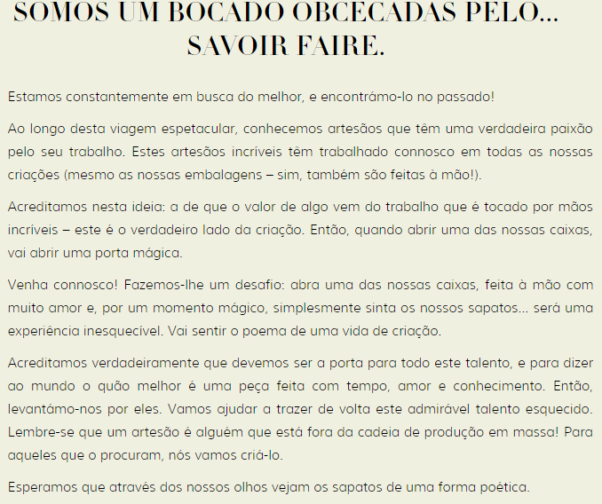 Da mesma forma, ao utilizar a expressão “savoir faire” já no texto de apresentação, a marca instiga a curiosidade do leitor e leva-o a continuar navegando pelo site, em uma seção cujo título enaltece o processo artesanal de fabricação de seus calçados. Ali, é possível encontrar vídeos, imagens e textos (figura 04) que não só explicam a maneira como os calçados são produzidos, mas também trazem informações sobre o posicionamento de luxo e reforçam a identidade da marca.
