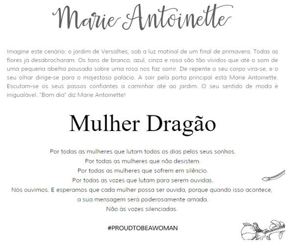 A presença da identidade da Josefinas também se faz presente em outros aspectos da comunicação da marca no site, como nos temas das coleções relacionados a mulheres, procurando elevar sua autoestima e enaltecer o empoderamento feminino. Alguns exemplos de releases são apresentados nas imagens a seguir: enquanto a coleção “Marie Antoinette” é relatada com um cenário da icônica rainha francesa, a coleção “Mulher Dragão” traz um manifesto de chamado pelos direitos das mulheres (figura 05). Em ambos os casos, a figura feminina é a protagonista da história, chamada para fazer parte do universo da marca através de uma enunciação coletivizada e pessoal (“nós”).