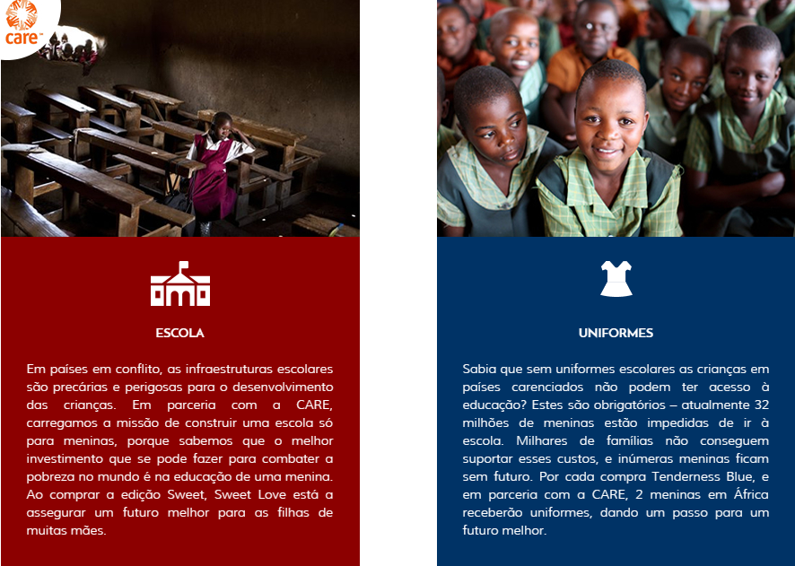 Além disso, a marca apoia causas sociais, como o “Women for Women International”, que ampara mulheres em situação de pobreza para a estabilidade econômica e a autossuficiência através de capacitações, apoio financeiro e fornecimento de alimentos. Outra entidade apoiada é a organização humanitária global CARE, que tem o objetivo de garantir acesso à educação às crianças africanas. A CARE utiliza os recursos recebidos com a venda da coleção “Mãe e Filha” para a construção de uma nova escola para as meninas na África e distribuição de uniformes escolares, como pode ser observado na (figura 06).