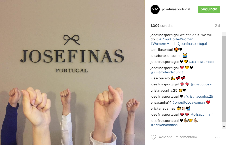 Segundo Magnolo e Moreira (2016), nos dias de hoje, a expansão do storytelling se dá também pela maneira que a marca se porta nos variados canais da internet, principalmente pela consonância do discurso nas diferentes redes sociais. Assim, observa-se que a Josefinas tem presença constante e reafirma sua identidade em diversas mídias como Facebook, LinkedIn, Instagram, Twitter, Pinterest, Tumblr, Google+ e Snapchat. Dentre essas, a CEO Maria Cunha, em entrevista para Hermanaviciute (2016), explica que as mais exploradas são o Facebook, por ser um meio que permite chegar às pessoas com facilidade, e o Instagram, por ser uma rede de “felicidade e momentos bonitos” que tem relação com o mundo da moda e do luxo.
