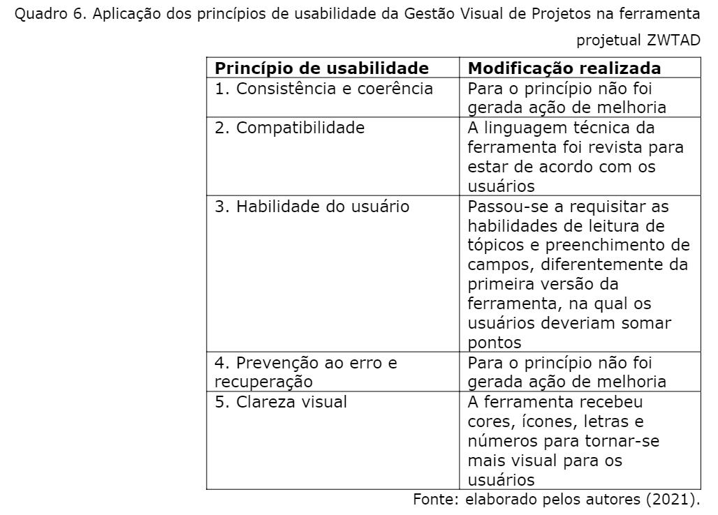 Após terem sido realizadas as modificações na ferramenta projetual ZWTAD com base nos requisitos supramencionados (Quadro 5), procedeu-se à análise da terceira dimensão dos elementos estruturantes da Gestão Visual de Projetos. Nessa perspectiva, Teixeira (2018) afirma que se deve levar em consideração na construção de modelos visuais os seguintes princípios de usabilidade: (I) consistência e coerência; (II) compatibilidade; (III) habilidade do usuário; (IV) prevenção ao erro e recuperação; e (V) clareza visual (Quadro 6).