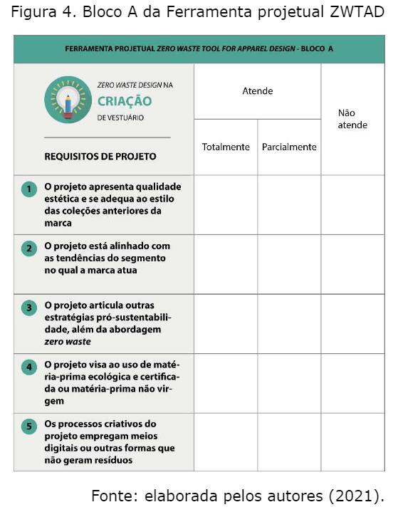 O primeiro bloco da ferramenta foi intitulado Zero Waste Design na criação de vestuário (Figura 4) e possui como requisitos de projeto: (I) o projeto apresenta qualidade estética e se adequa ao estilo das coleções anteriores da marca; (II) o projeto está alinhado com as tendências do segmento no qual a marca atua; (III) o projeto articula outras estratégias pró-sustentabilidade, além da abordagem zero waste; (IV) o projeto visa ao uso de matéria-prima ecológica e certificada ou matéria-prima não virgem; e (V) os processos criativos do projeto empregam meios digitais ou outras formas que não geram resíduos.