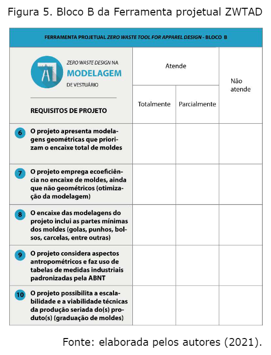 O segundo bloco da ferramenta, Zero Waste Design na modelagem de vestuário (Figura 5), apresenta como requisitos: (I) o projeto apresenta modelagens geométricas que priorizam o encaixe total de moldes; (II) o projeto emprega ecoeficiência no encaixe de moldes, ainda que não geométricos (otimização da modelagem); (III) o encaixe das modelagens do projeto inclui as partes mínimas dos moldes (golas, punhos, bolsos, carcelas, entre outras); (IV) o projeto considera aspectos antropométricos e faz uso de tabelas de medidas industriais padronizadas pela Associação Brasileira de Normas Técnicas (ABNT); e (V) o projeto possibilita a escalabilidade e a viabilidade técnicas da produção seriada do(s) produto(s) (graduação de moldes).