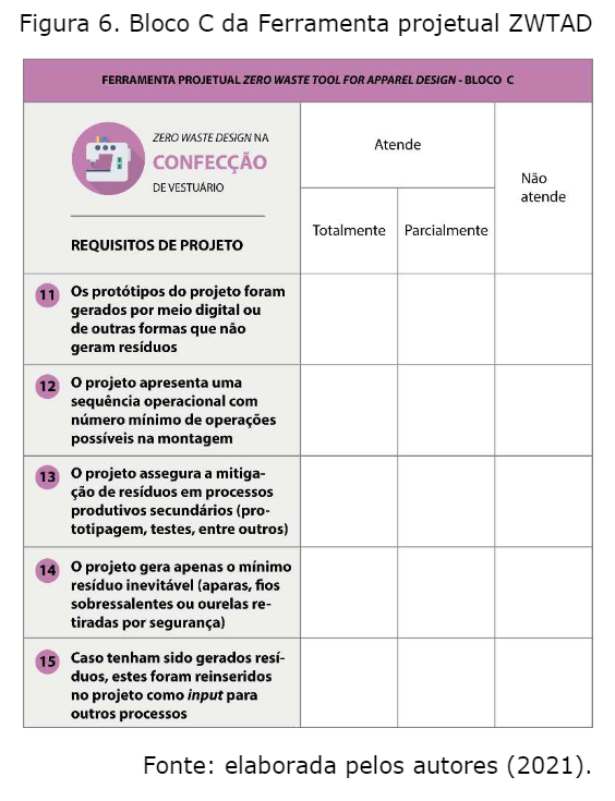 O terceiro e último bloco da ferramenta, denominado Zero Waste Design na confecção de vestuário (Figura 6), tem como requisitos de projeto: (I) os protótipos do projeto foram gerados por meio digital ou de outras formas que não geram resíduos; (II) o projeto apresenta uma sequência operacional com número mínimo de operações possíveis na montagem; (III) o projeto assegura a mitigação de resíduos em processos produtivos secundários (prototipagem, testes, entre outros); (IV) o projeto gera apenas o mínimo resíduo inevitável (aparas, fios sobressalentes ou ourelas retiradas por segurança); e (V) caso tenham sido gerados resíduos, estes foram reinseridos no projeto como input para outros processos.
