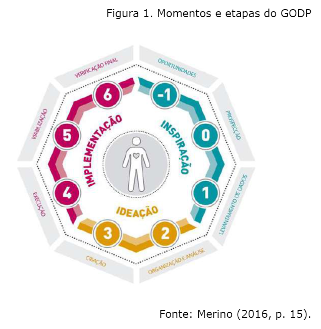 Merino, Varnier e Makara (2020) afirmam que o guia apresenta oito etapas: (I) oportunidades; (II) prospecção/solicitação; (III) levantamento de dados; (IV) organização e análise dos dados; (V) criação; (VI) execução; (VII) viabilização; e (VIII) verificação. Segundo os autores, as etapas do GODP podem ser compreendidas em três momentos: (I) inspiração, que envolve a primeira, a segunda e a terceira etapas; (II) ideação, que está relacionado a quarta e a quinta etapas; e (III) implementação, que contém a sexta, a sétima e a oitava etapas (Figura 1).