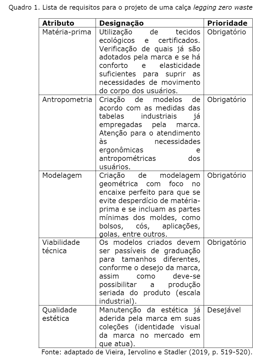 Antes de se apresentar o quadro de etapas, contudo, faz-se necessário destacar a contribuição de Vieira, Iervolino e Stadler (2019). Os autores criaram um checklist (lista de verificação, em livre tradução para a língua portuguesa) com atributos obrigatórios e desejáveis no contexto do projeto de uma calça legging zero waste. A saber: (I) matéria-prima; (II) antropometria; (III) modelagem; (IV) viabilidade técnica; e (V) qualidade estética (Quadro 1).
