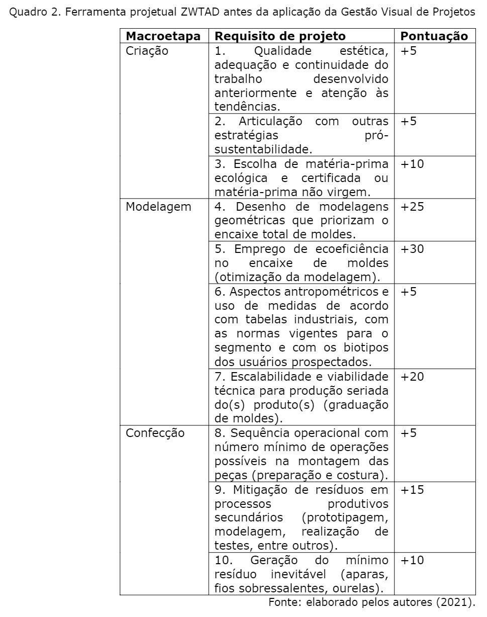 Como exemplo de ferramenta projetual passível de emprego no planejamento de coleção de vestuário cita-se a ZWTAD, desenvolvida com o intuito de assegurar que não ocorram desperdícios materiais ou sejam gerados resíduos sólidos têxteis no processo produtivo do vestuário. A ferramenta ZWTAD foi elaborada em duas etapas, que podem ser descritas como antes e depois da aplicação da Gestão Visual de Projetos. Tais etapas serão detalhadas a seguir, nos próximos tópicos deste artigo.