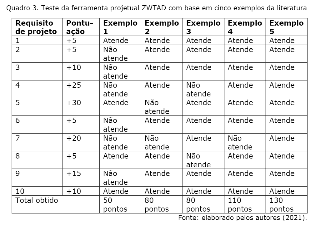 Após a criação do Quadro 2, para mensurar a pontuação máxima a ser obtida, foi estipulado que: (I) se o usuário da ferramenta projetual atende totalmente ao requisito de projeto, creditar-se-á a pontuação máxima; e (II) se o usuário da ferramenta projetual não atende ao requisito ou atende parcialmente, creditar-se-á zero pontos.