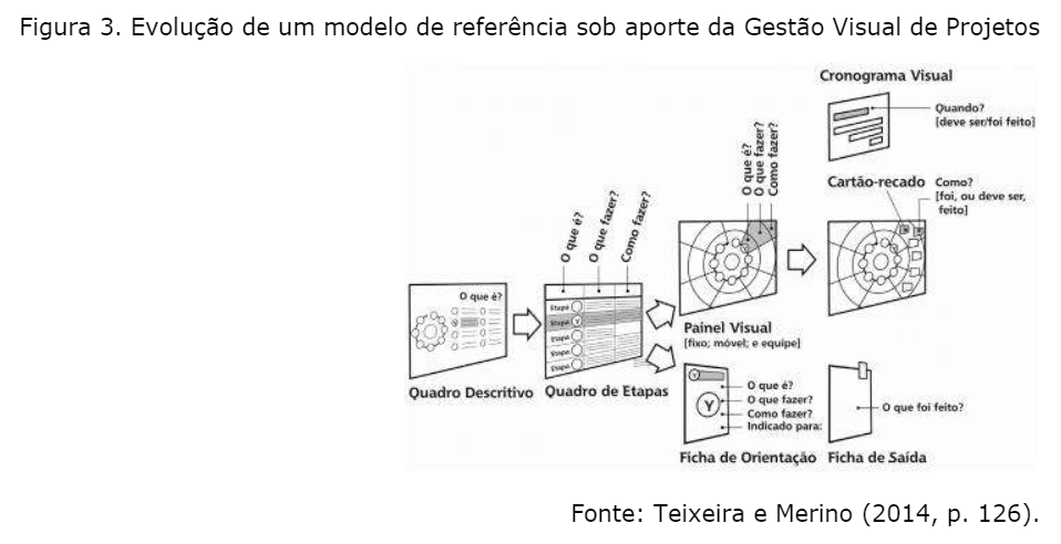 Teixeira e Merino (2014) e Teixeira (2018) sinalizam que a Gestão Visual de Projetos pode subsidiar, gradualmente, a evolução de uma ferramenta projetual. Como exemplo, os autores apresentam a transformação de um quadro descritivo como modelo de referência que, ao agregar novos tópicos de organização como “o que é?”, “o que fazer?” e “como fazer?”, passa a ser considerado um quadro de etapas. Na sequência, para dar visibilidade às etapas e às atividades em desenvolvimento por uma determinada equipe, somam-se elementos de representação gráfica para fornecer uma visão sistêmica do projeto. Tem-se, assim, um painel visual que pode, ainda, desdobrar-se em outras ferramentas, como cronogramas visuais, cartões-recados, fichas de orientação e de saída, entre outras (Figura 3).