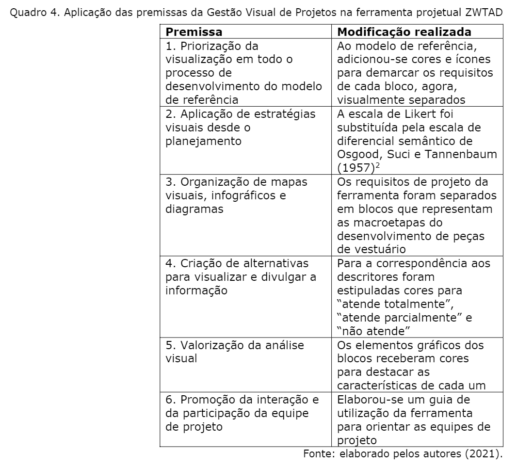 Logo, com relação à aplicação do painel visual do GODP conforme prescreve Merino (2014; 2016), na primeira e na segunda etapas foram levantadas informações e prospectadas oportunidades (Figura 2); na terceira etapa, recortou-se a lista de atributos de Vieira, Iervolino e Stadler (2019); na quarta e quinta etapas, a lista supramencionada foi convertida em uma tabela de requisitos de projeto (Quadro 2); na sexta e sétima etapas, executou-se o teste da ferramenta projetual a partir de cinco exemplos evidenciados na literatura sobre zero waste (Quadro 3); e, por fim, na oitava etapa verificou-se a necessidade do emprego da Gestão Visual de Projetos para potencializar o uso da ferramenta projetual ZWTAD perante estilistas e designers de vestuário.