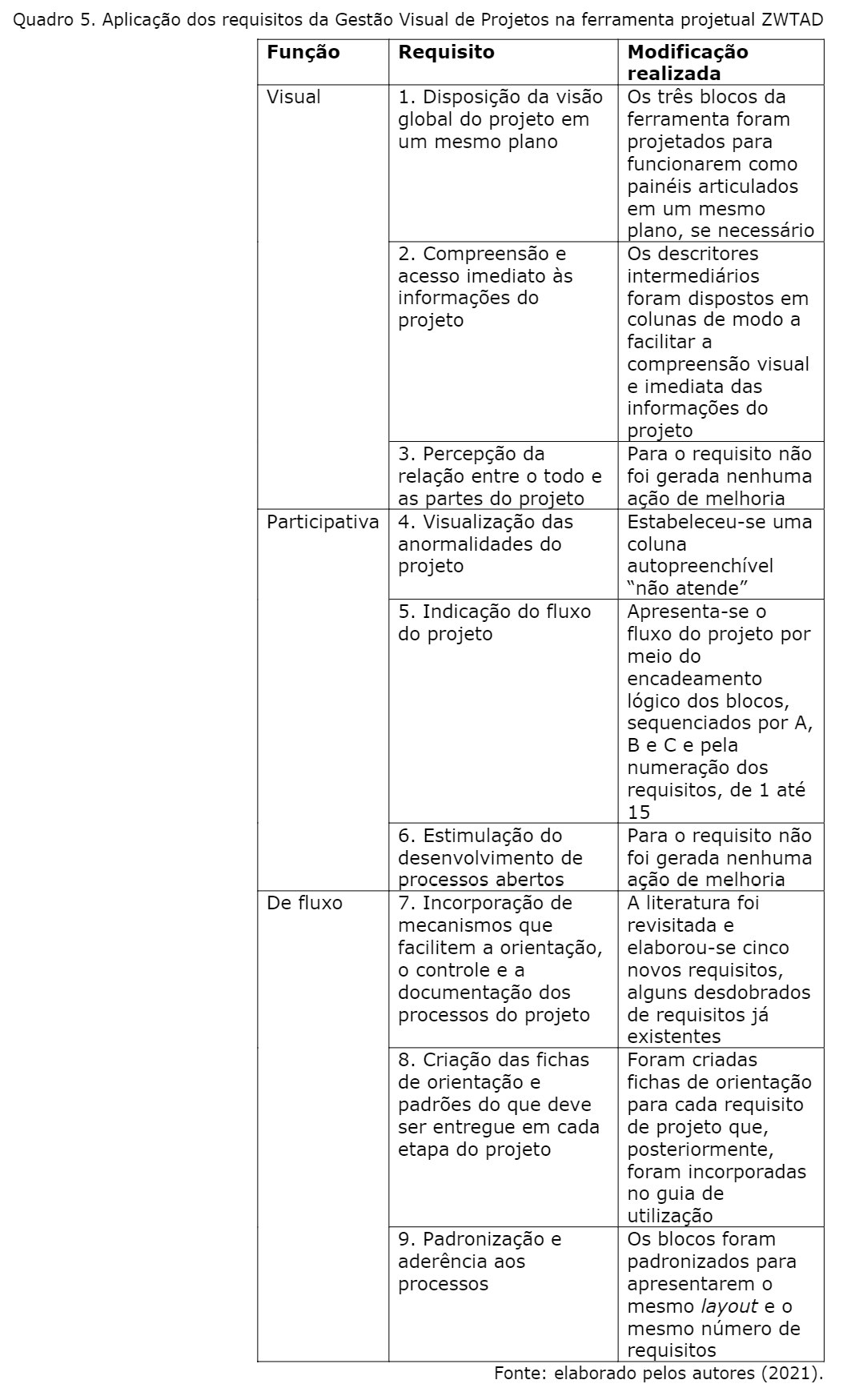 Empreendidas as modificações na ferramenta projetual com base na primeira dimensão da Gestão Visual de Projetos, partiu-se para os requisitos. Para Teixeira (2018), o objetivo dos requisitos está em potencializar o sucesso dos modelos visuais e suas funções podem assumir três naturezas1: (I) visual; (II) participativa; e (III) de fluxo. Quanto à função visual, o autor orienta que se deve buscar respostas para os seguintes questionamentos: (I) como permitir a visão global do projeto em um mesmo plano?; (II) como favorecer a compreensão e o acesso imediato das informações do projeto?; e (III) como facilitar a percepção da relação entre o todo e as partes do projeto?. No que diz respeito à função participativa, os requisitos a serem respondidos são: (I) como tornar visíveis as anormalidades do projeto; (II) como garantir o fluxo do projeto?; e (III) como estimular o desenvolvimento de processos abertos, simples, fáceis e visuais?. Por último, no tangente à função de fluxo, deve-se atender aos requisitos, com as seguintes perguntas: (I) como incorporar mecanismos que facilitem a orientação, o controle e a documentação dos processos do projeto?; (II) como criar fichas de instrução e padrões do que deve ser entregue a cada etapa do projeto; e (III) como apoiar a padronização dos trabalhos e a aderência aos processos? (Quadro 5).