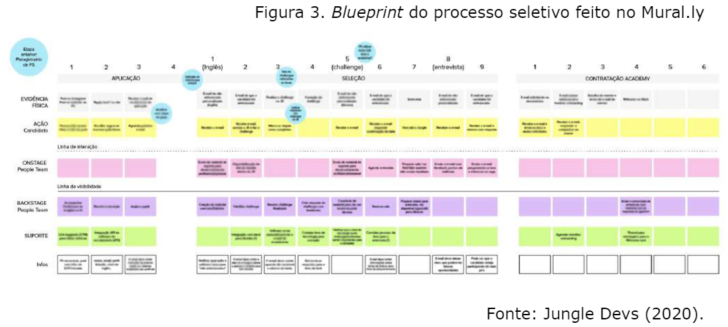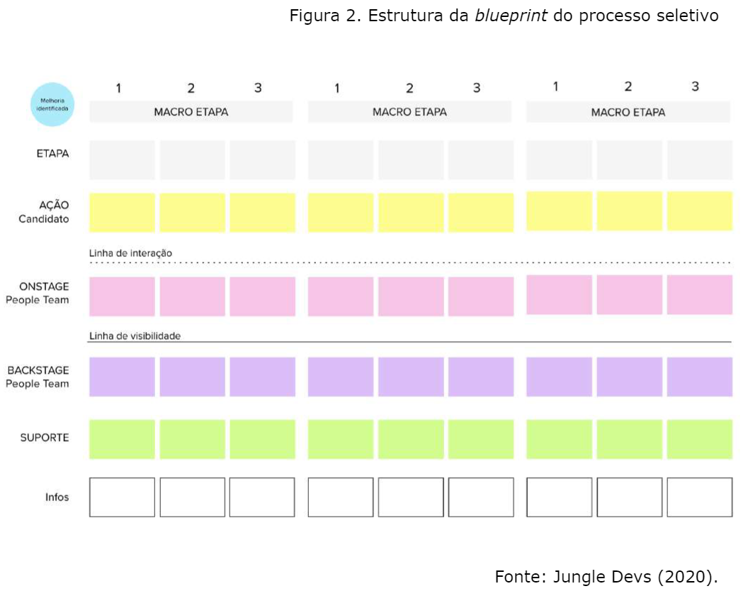 Com o propósito de implementar uma adaptação para um processo que atenda este contexto remoto e que seja continuado numa futura modalidade mista, foi utilizado como objeto de estudo um processo de seleção para estágio. Posto isso, o objetivo deste estudo é apresentar conceitos de Design e Gestão Visual à área de Recursos Humanos e implementar o service blueprint como uma ferramenta facilitadora no mapeamento de experiências dos processos da mesma.