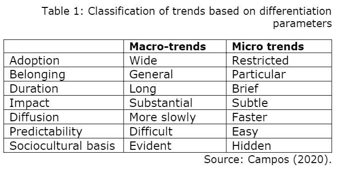 The word trend is polysemic and is understood as a synonym for movement, novelty, anticipation, uncertainty, society photography and being in vogue in a certain space and time (CAMPOS; WOLF, 2018; ERNER, 2015; DRAGT, 2017; RAYMOND, 2010; RECH, 2013; RECH; GOMES, 2016). In this sense, it can be seen as “phenomena that provide tangible evidence of social, relational and cultural changes” and have an “intricate life cycle, in constant evolution” (RECH, 2013, p. 109). In this sense, from a taxonomy, the trends can be divided into two main categories, presented in Table 1: