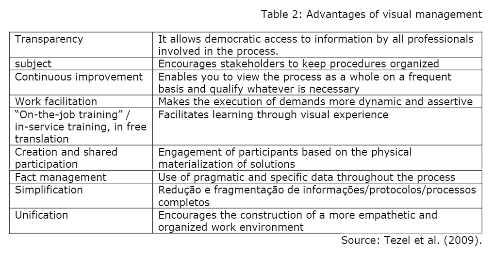 Thus, the advantages of using the visual management approach are presented based on the research conducted by Tezel et al. (2009), which are: