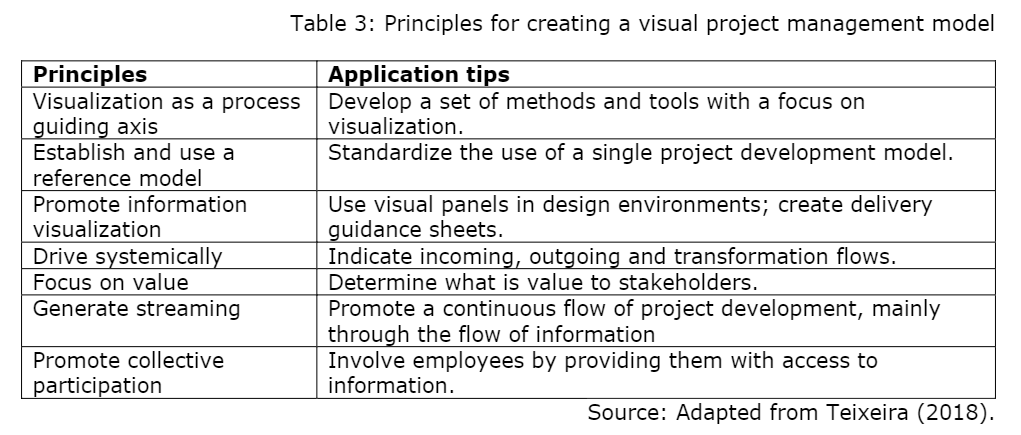 In addition, Teixeira (2018) underlines principles for proposing the visual management of a project, which will be valid for the analysis and interpretation of data later, detailed below: