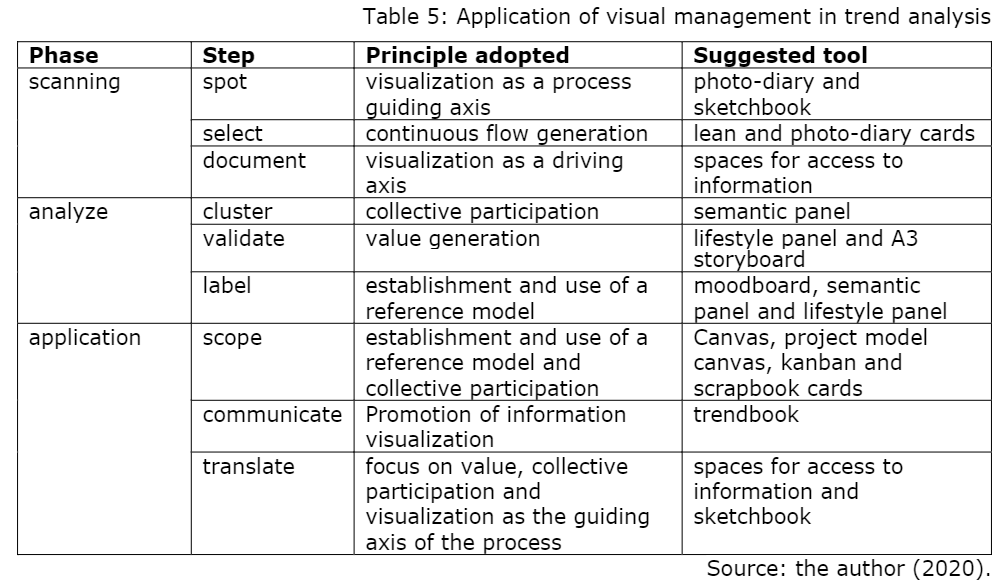 Ultimately, this analysis ends with table 5, summarizing the main results achieved through the theoretical-conceptual articulation of the phases and steps of the trend analysis model, together with the principle adopted and the suggested tool, originating from management visual.