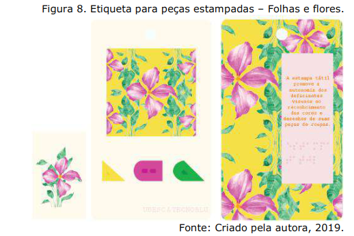 No verso das tags apresenta-se um breve texto a respeito da origem da proposta, assim como a inscrição em braille do título do projeto: Estampa tátil. A inserção de um texto explicativo tem o objetivo de expor aos demais consumidores, que não possuem nenhum tipo de dificuldade de apreensão visual, a iniciativa.