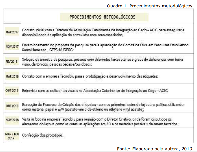As características metodológicas da pesquisa conduzem a um estudo exploratório, descritivo do ponto de vista dos objetivos e de análise qualitativa. A pesquisa de campo foi realizada junto a Associação Catarinense de Integração ao Cego (ACIC), pelo qual foram realizadas entrevistas com o público alvo com foco na interação dos usuários com o vestuário. Além da coleta de informações técnicas e a parceria com a empresa Tecnoblu Your ID (TECNOBLU), especializada na criação de artigos personalizados para o vestuário1.