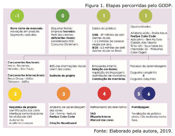 O Guia de Orientação para o Desenvolvimento de Projetos – GODP (MERINO, 2016), metodologia aplicada neste estudo, conduziu o processo de criação das etiquetas táteis, mapeando as oportunidades de prospecção e traçando requisitos de projeto.
