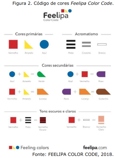 O código de cores Feelipa Color Code, característica de influência para o desenvolvimento da proposta, presente nesta etapa da criação, foi adaptado em busca da expansão do espectro cromático vislumbrado pelos deficientes visuais.