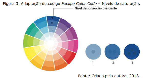 Assim, foi desenvolvida uma adaptação do Feelipa Color Code, possibilitando acrescentar infinitas combinações e níveis de saturação. Para isso, foram mantidas as bases geométricas criadas pelo código, porém foram acrescidas sobre as bases a forma correspondente, sendo os níveis de saturação aumentados conforme a quantidade sobreposta (Figura 3).