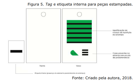 Seguindo a mesma proposta de layout das etiquetas para peças lisas, foram desenvolvidas as interfaces para peças estampadas, cerne deste estudo. O elemento de identificação dos padrões é o rapport5 disposto no centro da tag. Abaixo são indicadas as cores presentas na estampa, em ordem de predominância. Na etiqueta interna são identificados os elementos predominantes da estampa, já que seu tamanho reduzido não permite apresentar o rapport por inteiro (Figura 5).