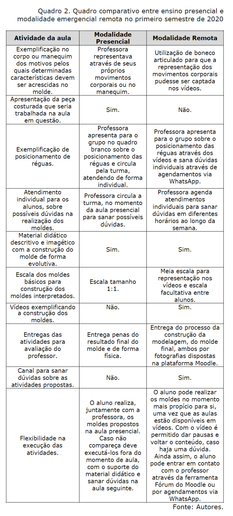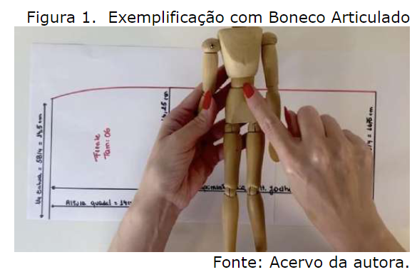 Analisando o quadro é possível perceber as diferenças e aspectos positivos e negativos do ensino emergencial remoto. Foram necessárias várias adaptações para que as exemplificações pudessem ser captadas pelo vídeo no processo evolutivo da construção das modelagens e para que esses não precisassem ter mudanças de cenário - o que os tornariam cansativos para os alunos, uma vez que as comparações entre corpo e moldes são de suma importância para o processo. Dessa forma, foi relevante utilizar o boneco articulado, executar o traçado dos moldes em diferentes folhas para que a inserção de cores vermelhas do traçado realizado no momento e de preto para os já executados pudessem acontecer. A utilização dos mesmos materiais didáticos que os discentes trabalhavam nas aulas presenciais e nas aulas remotas permitiram que existisse um maior conforto para os discentes, uma vez que eles já estavam acostumados aos processos de construção descritos neles.