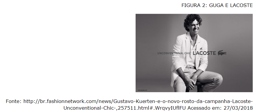 Já no próximo exemplo, a celebridade endossadora consegue mostrar ao consumidor que o produto faz realmente parte da sua vida. Na figura 2, o ex-jogador de tênis Gustavo Kuerten é o garoto propaganda da marca de roupas Lacoste. Neste caso, o endosso é perfeito, pois essa marca foi criada por um jogador de tênis e ainda é a patrocinadora de grandes jogadores da atualidade, como Novak Djokovic e Alize Cornet. O endosso aqui se torna claro e válido. O consumidor não se sente enganado e consegue enxergar as possibilidades da compra.