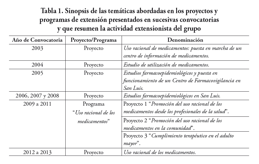 Las actividades que se desarrollaron y que se continúan desarrollando en el marco de los Proyectos de Extensión Universitaria, sufren un proceso de articulación con los Proyectos de Investigación de la Secretaría de Ciencia y Técnica de la UNSL, dirigidos por la Dra. Claudia Patricia Calderón [PROIPRO 2-0107: “Estudios de utilización de medicamentos en San Luis” (2007-2009); PROIPRO 2-0107: “Estudios de utilización de medicamentos en Cuyo” (2010-2011); PROICO 2-0412: “Estudios farmacoepidemiológicos en Cuyo” (2012-2015) y PROICO 2-0416: “Estudios farmacoepidemiológicos en Cuyo” (2016-2019)].