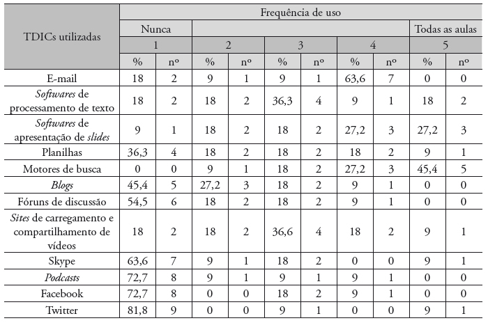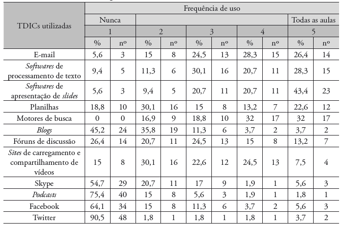 Identificou-se que, dentre as variadas TDICs listadas, as utilizadas com mais frequência pelos docentes são os motores de busca (32,1% afirmam usar em todas as aulas) e os softwares de apresentação de slides (43,4% afirmam usar em todas as aulas). Quanto aos recursos menos empregados, 45,3% dos docentes afirmam nunca usar blogs, 54,7% nunca usam Skype em contextos educacionais, 75,5% nunca usam podcasts, 64,2% nunca usam Facebook e 90,6% nunca usam Twitter. A Tabela 1 detalha os quantitativos.