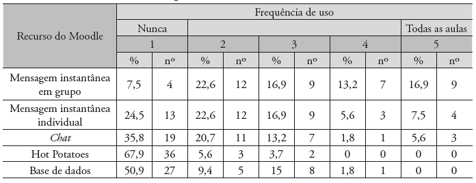 Com relação à frequência de uso dos recursos do Moodle pelos docentes da amostra que afirmam utilizá-lo (42), o mais empregado é a mensagem instantânea em grupo, pois 16% (9) afirmam usá-la em todas as aulas. O menos utilizado é o Hot Potatoes: 67% (36) dos docentes nunca usaram esse recurso. Considerando as especificidades do Hot Potatoes, que se trata de um software que possibilita desenvolver seis distintos tipos de exercícios, sua adoção implica avaliar a pertinência de tais atividades à proposta do programa da disciplina. Seu planejamento e desenho, além da necessidade de aprender a operacionalizá-lo, podem configurar aspectos eventualmente desvantajosos à sua adoção.
