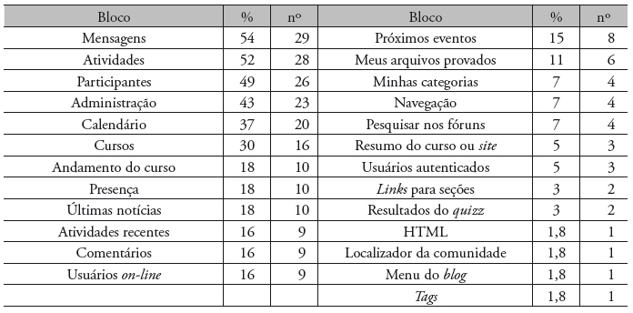 No Moodle, existem mais de 20 blocos disponíveis para a construção do AVEA conforme a conveniência e as necessidades do docente para a oferta da disciplina. A Tabela 4 lista os blocos de acordo com a quantidade de docentes que os utilizam.