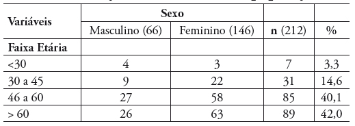 A população do estudo revelou uma predominância do sexo feminino e faixa etária acima de 60 anos (43,9%). Tais características se mantiveram semelhantes às descritas em outros estudos (BRAGANÇA, 2010; BORTOLETTO; HADDAD; KARINO, 2009; SOUZA, 2008).