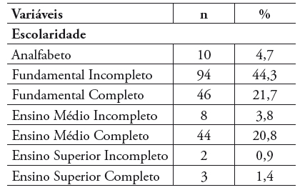 Quanto à escolaridade, 4,7% declaram nunca terem ido à escola e 44,3% não concluíram o ensino fundamental (Tabela 2).