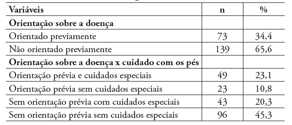 O nível de escolaridade e a localização territorial refletem diretamente no conhecimento sobre o DM e suas complicações mais comuns, a forma correta de tratamento e sua adequada prevenção (SANTOS et al., 2011). Tal averiguação não foi diferente nesta pesquisa. Quando questionados sobre conhecerem a Síndrome do pé diabético, 139 (65,6%) pacientes afirmaram não saber do que se trata. O dado é preocupante, considerando a importância da informação para uma prevenção efetiva desta complicação e que a maioria dos pacientes a desconhece. Deste total, apenas 43 (30,9%) referiram realizar algum tipo de cuidado com os pés, reafirmando ainda mais a necessidade do conhecimento disseminado.