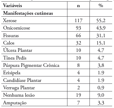 Abstract: This article reports a descriptive, cross-sectional study originated in the extension project titled “Care and information: permanent multiprofessional attention to dermatologic feet disorders of diabetic patients”. It aims at identifying skin changes in feet, providing information about diabetic foot and offering recommendations for prevention. The study was carried out with 212 diabetic patients treated at the endocrinology and medical clinic of a university hospital through interview and physical examination of the feet, which showed the patients’ low level of knowledge about diabetic foot syndrome as well as a significant association between longer diagnosis of diabetes mellitus and the presence of skin lesions (p=0,01) - especially xerosis (55,2%), onychomycosis (43,9%) and fissures (31,1%). This study reinforces the need to instruct and encourage the practice of self-care as a way to reduce this complication.
