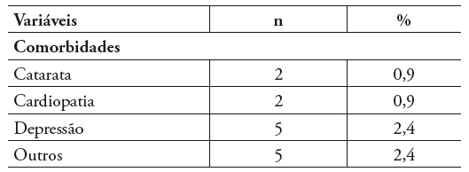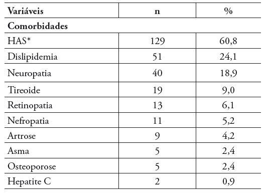 Em relação às comorbidades associadas ao curso do DM entre os pacientes envolvidos, a hipertensão arterial sistêmica (60,8%) teve lugar de destaque, seguida da dislipidemia (24,1%) e da neuropatia periférica (18,9%) (Tabela 5).