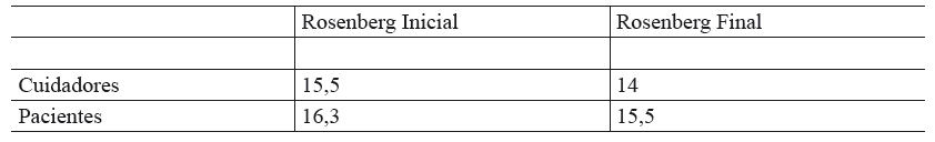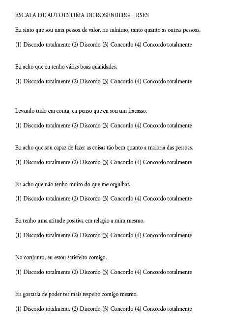 Em relação aos resultados da aplicação da Escala de Rosenberg foi perce- bida uma diminuição nas médias finais obtidas em ambos os grupos de indivíduos avaliados. Resultados Explanados na tabela 3.