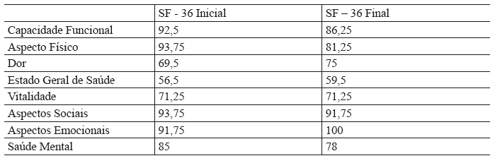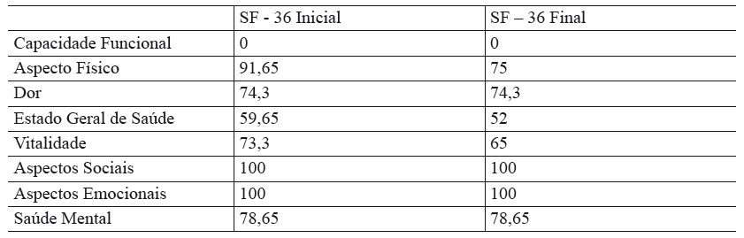 Em relação à aplicação do SF-36 nos pacientes, os piores escores obtidos anteriores ao programa de orientações foram: 1º Capacidade Funcional obtendo 0 de escore; 2º Estado Geral de Saúde com 59,65 de média e 3º Vitalidade com 73,3. Após o programa de orientações: 1º Capacidade Funcional com 0 de escore; 2º Estado Geral de Saúde com 52 pontos e 3º Vitalidade com 65 de média. Resultados apresentados na tabela 2.
