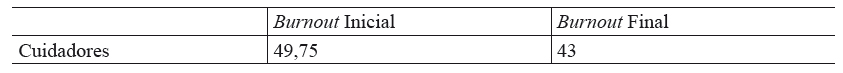 Quanto à Burnout, foi apontada uma diminuição do contato dos cuidadores com a síndrome, sendo que na aplicação da MBI inicial, os cuidadores obtiverem uma pontuação de 49,75 de média e final de 43 conforme a tabela 4.