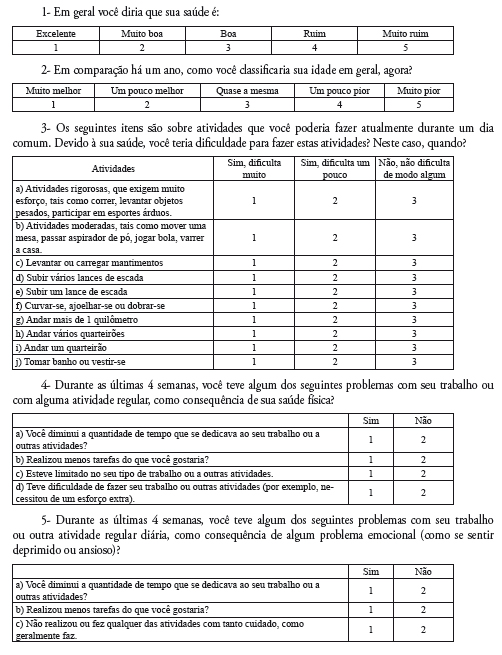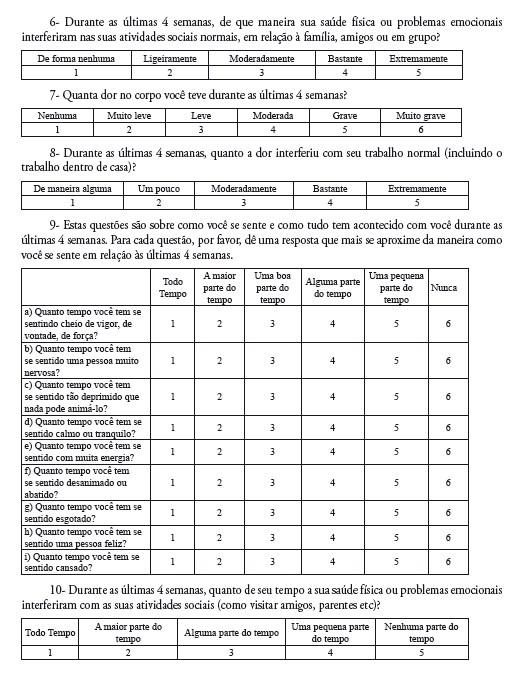 O SF-36 avalia mediante 8 domínios: capacidade funcional, limitação por aspectos físicos, dor, estado geral de saúde, vitalidade, aspectos sociais, aspectos emocionais e saúde mental. Ele apresenta um escore final em cada domínio que vai de zero a 100 pontos, no qual zero corresponde ao pior estado geral de saúde e 100 ao melhor estado de saúde (TSUKAMOTO; PICINATTO; CAVALINI; BORTOLLOTI, 2010).