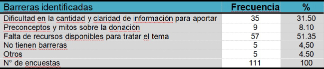 De la información aportada por los diferentes grupos educativos, surgieron como mayores inquietudes la dificultad en relación a la carencia de información, representada especialmente en "creencias o preconceptos erróneos sobre el tema" que provocao erróneas ideas acerca del procedimiento, lo cuallleva a un rechazo de la temática por llegar a consideraria incluso hasta peligrosa (Ej. Temor, Miedo, Temor a ser donante porque quizás hace falta más información a la población, Temor y esperanza de vida, culpa y remordimiento, etc.).