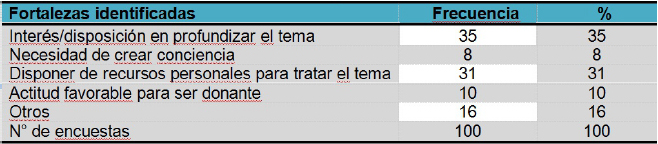 Notamos que también fue significativa la aparición de ideas en tomo al conocimiento de realidades cercanas en este aspecto, o incluso quienes se manifiestan donantes de órganos y tejidos, abiertamente dentro de este grupo. Las experiencias cercanas pueden funcionar como condicionantes en cierta medida, tanto en relación al deseo de hacerse donante o transmitir información, como así también por el contrario, el tan conocido ejemplo del "nunca nos va a tocar", que nos lleva a aquella idea planteada por Freud de la creencia inconsciente en nuestra propia inmortalidad (Freud S, 2008). Queremos mencionar con esto, la importancia del concepto de "empatía", en varias oportunidades mencionado por los sujetos participantes, desde el cual no necesitamos del atravesamiento de determinadas circunstancias vitales para poder resonar con otras realidades que no nos toquen de cerca. Este aspecto se hace parte de los "recursos personales" percibidos, tanto desde las barreras (carencias de ellos en relación a esta problemática) como desde las Fortalezas, proponiéndolo como la herramienta casi fundamental para lograr asimilar y transmitir correctamente este tipo de información. Observamos en la Tabla 2 los resultados encontrados con respecto a este eje.