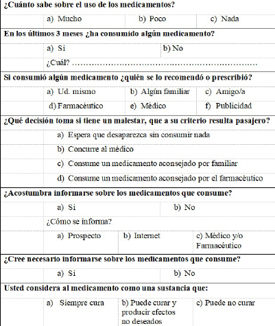 La encuesta fue organizada con preguntas, en su mayoria cerradas, que incluyeron datos sociodemográficos (edad y sexo), y referenciadas a características de conocimientos y actitudes personales frente al uso de medicamentos. Las encuestas no incluyeron datos personales, que permitiesen la individualización del encuestado.