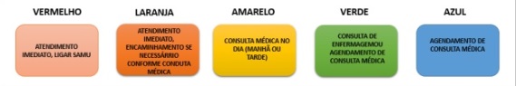 A princípio, a Classificação de Risco é caracterizada de acordo com protocolo local. No município, foi estabelecido que a cor vermelha e laranja significam uma intervenção da equipe no mesmo momento. Atendimento para situações de risco moderado correspondem à cor amarela, verde e azul, os quais necessitam de intervenção breve da equipe, podendo ser ofertada primeiramente medidas de conforto pela equipe de enfermagem até uma nova avaliação ou atendimento no dia, levando em conta a estratificação de risco e a vulnerabilidade da situação (BRASIL..., 2016; BRASIL..., 2017).