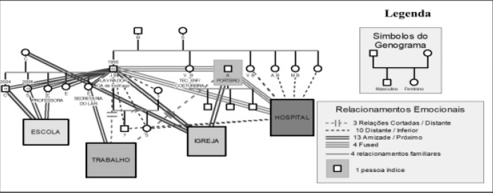 O genograma é a construção de uma árvore familiar, sendo necessário no mínimo três gerações; nesse momento, pode-se visualizar os aspectos familiares relacionados com processo saúde-doença, ocupação, religião, relacionamentos, sejam eles positivos ou negativos, já o ecomapa avalia as relações do familiar com outros contatos, que não necessariamente da família. Os dois instrumentos são avaliados pelo impacto visual (SOUZA et al., 2010). Esses foram construídos de maneira interligada, por meio do software GenoPro 2019.