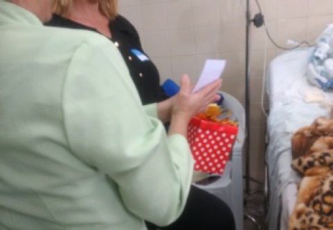 Cuidado Espiritual - Consistiu em oferecer um presente que continha perguntas reflexivas descobertas gradativamente: 1. Este presente você recebeu de uma pessoa muito especial e que está te ajudando muito neste momento. Quem é essa pessoa? I 2. Se no momento você pudesse receber qualquer presente, qual seria? I 3. Você tem fé em... I 4. Sua esperança está em... 15. Escolha uma música que te faria bem agora. Assim, após responder às perguntas de forma reflexiva, a pessoa submetida à dinâmica ouve a música escolhida, através do acesso à internet. A dinâmica oportunizou ao familiar refletir que sua fé já esteve abalada, mas que neste momento ela se fortalecia de modo que mobilizava nele a esperança pela cura do seu pai e pelo resgate da rotina de toda a família. Ao final do cuidado, o familiar relatou a importância daquela reflexão, sugerindo ao grupo realizar a mesma intervenção com o acompanhante ao lado.